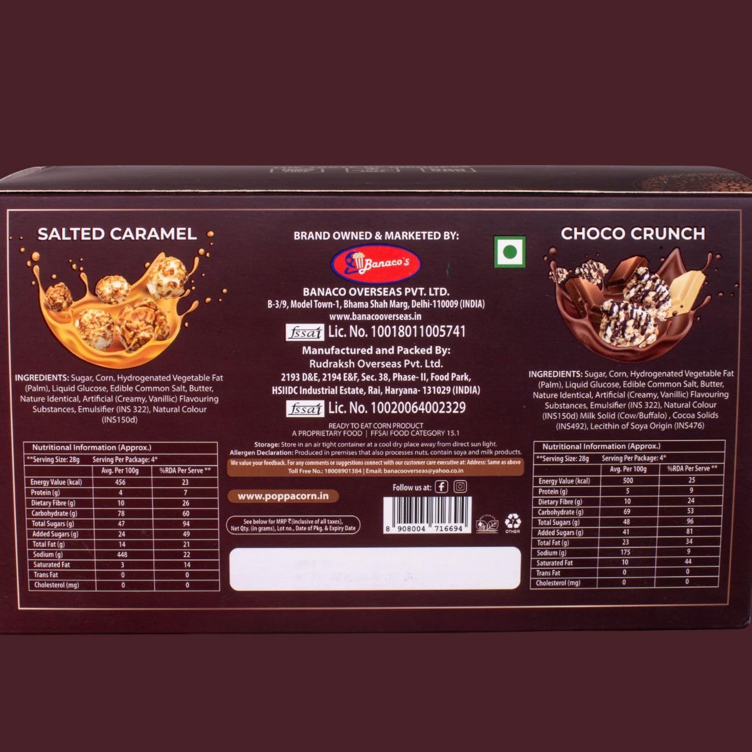 • Gourmet Popcorn Variety Pack: Indulge in a delectable assortment of 4 distinct flavours – Salted Caramel, Choco Crunch, Butter Toffee, and Nutty Choco Delight.